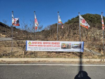 | 고흥군은 가정과 농경지에서 생활폐기물·영농부산물 불법소각 행위가 빈번하게 발생함에 따라, 무관용 원칙을 적용한 강력 단속에 나선다. 사진은 불법소각 행위 금지 안내 현수막 |