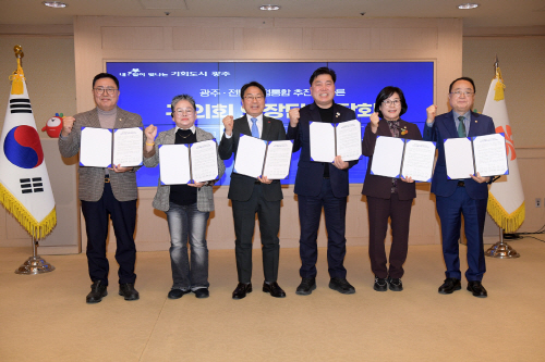 광주시는 12일 시청 비즈니스룸에서 ‘광주·전남 행정통합’ 관련 자치구의회 의장단 간담회를 열어 ‘(가칭)광주전남특별시’의 성공적인 안착을 위해 상호 긴밀히 협력키로 하는 대통합 공동 선언문을 채택, 발표했다.