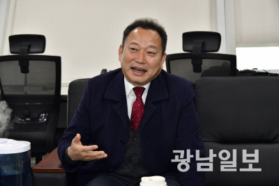 | 김주업 진보당 광주시당위원장이 12일 광주시의회에서 차담회를 갖고 오는 6월 지방선거 전략에 대해 이야기하고 있다. |