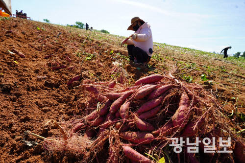 | 해남군 대표 농특산물인 해남고구마가 중·소농 공동출하 체계를 통해 국내 최대 도매시장인 서울 가락시장에 진출했다. 해남 농민들이 재배한 해남고구마를 수확하는 모습. |