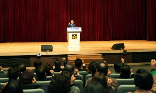 | 김영록 전남도지사가 13일 도청 김대중강당에서 열린 ‘광주·전남 행정통합 사회단체 범도민 결의대회’에서 인사말을 하고 있다. |