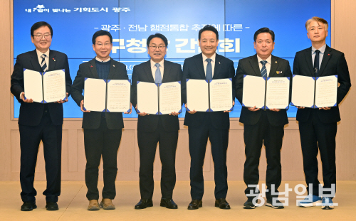 | 13일 오후 광주 서구 치평동 광주시청 비즈니스룸에서 강기정 광주시장과 5개 구청장들이 광주·전남 대통합 성공을 위한 공동 선언문에 서명한 뒤 기념촬영하고 있다.최기남 기자 bluesky@gwangnam.co.kr |