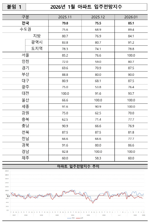 전국 아파트 입주전망지수는 85.1로 지난달보다 9.6p 상승했다.