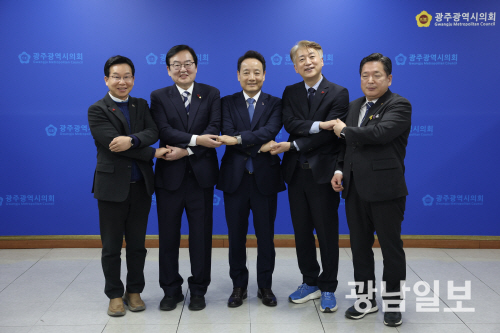 | 광주시구청장협의회가 13일 광주시의회에서 광주시와 전남도의 행정통합 논의에 적극 참여하기로 의견을 모았다.(왼쪽부터 박병규 광산구청장, 문인 북구청장, 임택 동구청장, 김이강 서구청장, 김병내 남구청장) 사진제공=광주시구청장협의회 |