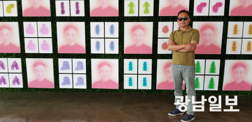 | 2022년 ‘검은 심장’이라는 주제로 열린 공장미술제 때 선보인 작품 ‘나는 너다’ 앞에서 포즈를 취한 김상연 작가. |