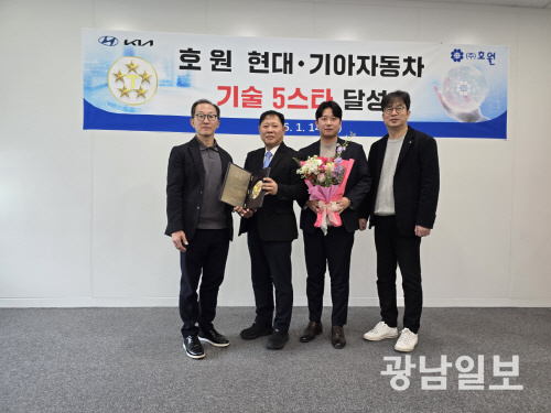 | ㈜호원은 14일 경기도 화성시 현대차 남양연구소에서 열린 현대기아자동차그룹 ‘2025년 협력사 평가’에서 기술 5스타 인증패를 수여했다. 사진 왼쪽부터 김형기 현대기아자동차 남양연구소 통합안전환경품질센터장, 윤창권 ㈜호원 대표, 양승빈 ㈜호원 부사장, 오세훈 현대기아차 남양연구소 연구개발품질실장. |
