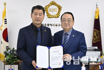 | 광주 북구의회는 최근 입법 고문으로 최민수 지방자치의정연구소장(사진 왼쪽)을 재위촉했다. |