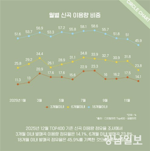 김 데이터저널리스트는 “18개월 이내 신곡 점유율이 절반 밑으로 떨어진 것은 해당 조사를 시작한 2024년 7월 이래 처음 있는 일”이라며 “그만큼 신곡이 차트에서 영향력을 발휘하지 못했다는 것을 의미한다”고 설명했다.