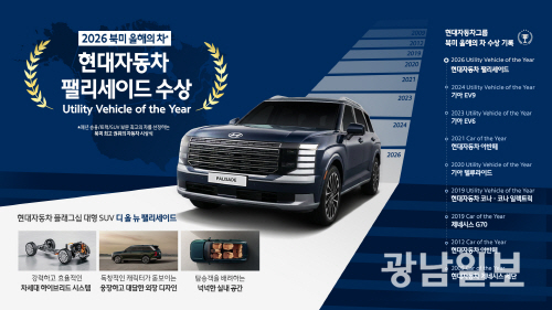 현대차는 14일(현지시각) 미국 디트로이트 헌팅턴 플레이스(Huntington Place)에서 열린 ‘2026 북미 올해의 차’ 시상식에서 팰리세이드가 유틸리티 부문 ‘북미 올해의 차’로 최종 선정됐다고 15일 밝혔다.