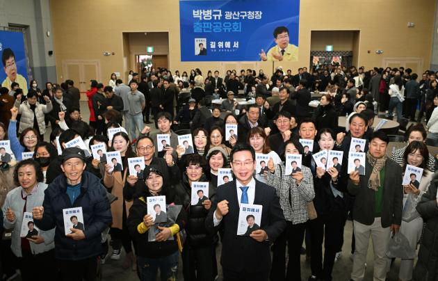 | 박병규 광주 광산구청장이 지난 17일 광주여자대학교 국제회의실에서 열린 저서 ‘길 위에서 얻은 사유, 민주주의를 다시 배우다’의 출판기념회에서 참석자들과 기념촬영을 하고 있다. |