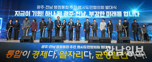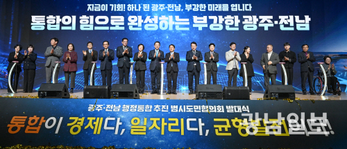 | 광주·전남 행정통합 추진 범시도민 협의회 발대식 16일 오후 광주 서구 치평동 김대중컨벤션센터에서 열린 광주·전남 행정통합 추진 범시도민 협의회 발대식에 참석한 강기정 광주시장과 김영록 전남도지사및 주요내빈들이 통합기원 퍼포먼스를 하고 있다.최기남 기자 bluesky@gwangnam.co.kr |