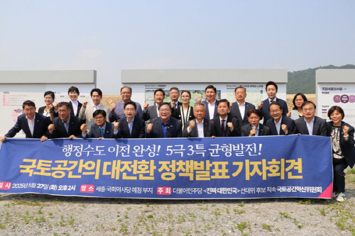| 더불어민주당 진짜 대한민국 선거대책위원회 후보 직속 ‘국토공간혁신위원회’(공동위원장 김태년·김경수)는 지난해 5월 27일 오후 2시 국회 세종의사당 예정 부지에서 충청권 경청 투어 ‘행정수도 이전 완성! 5극 3특 균형발전! 국토공간 대전환’ 정책발표 기자회견을 열었다. |