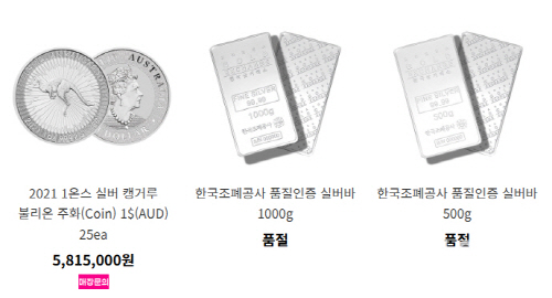 한국금거래소 공식 홈페이지에서도 한국조폐공사 품질인증 실버바는 모두 품절됐고, 한국금거래소 실버바 역시 100g과 500g 제품은 품절된 상태로 1㎏ 제품만 판매되고 있다.