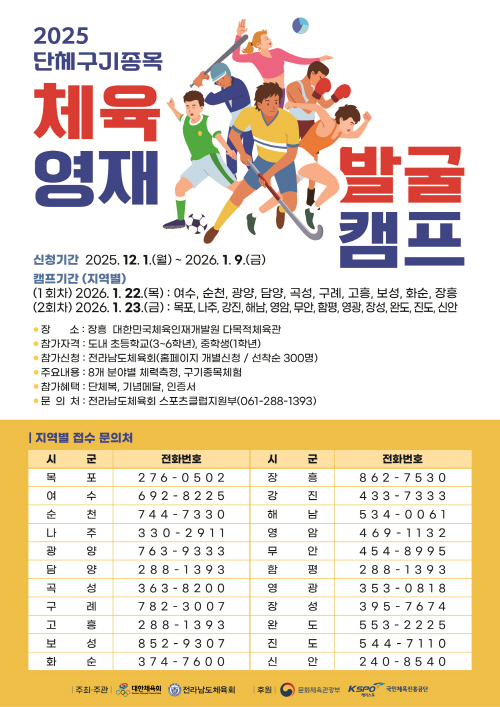 송진호 전남도체육회장은 “이번 캠프는 단순한 체력 측정을 넘어 학생들의 숨은 재능을 발굴하고, 미래 유망 체육인재로 성장할 수 있는 맞춤형 플랫폼이 될 것”이라며 “앞으로도 대한체육회 공모 실적을 통해 지속적인 프로그램 운영으로 전남 체육영재 발굴 육성에 최선을 다하겠다”고 말했다.