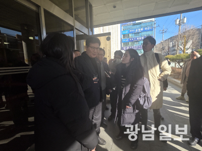 | 광주지법 형사1-2부(연선주·김대현·김유진 부장판사)는 22일 뇌물수수 등 혐의로 기소된 이상익 군수에 대한 항소심에서 원심과 같이 무죄를 선고했다. 사진은 이상익 함평군수가 무죄를 선고받은 뒤 기자들의 질문에 답변하는 모습. |