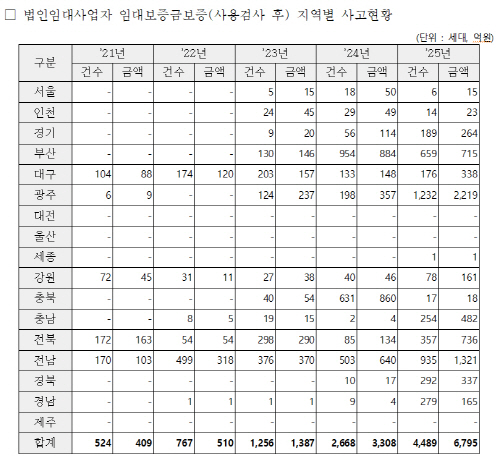 지난 5년간 법인 임대보증금 보증 사고 금액·가구는 2021년 409억원(524가구), 2022년 510억원(767가구), 2023년 1387억원(1256가구), 2024년 3308억원(2668가구), 지난해 6795억원(4489가구)으로 급증했다.