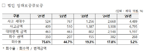 법인 임대보증의 회수율은 2021년 75.6%, 2022년 44.7%, 2023년 19.3%, 2024년 17.8%로 점점 떨어지다가 지난해 5.2%로 급락했다.