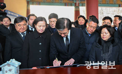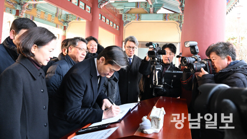 | 방명록 쓰는 조국 대표 조국 조국혁신당 대표가 23일 오전 광주 북구 운정동 국립5·18민주묘역을 찾아 방명록을 쓰고 있다. 최기남 기자 bluesky@gwangnam.co.kr |