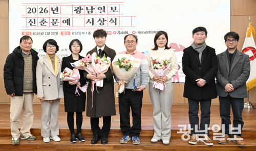 | 시상식 후 당선자들과 심사위원들이 기념촬영에 응했다. 왼쪽부터 곽재구 시 심사위원, 배다인 동화 심사위원, 윤소정 동화 당선자, 최류빈 평론 당선자, 민병훈 시 당선자, 차현숙 소설 당선자, 정강철 소설 심사위원, 김영삼 평론 심사위원. 최기남 기자 bluesky@gwangnam.co.kr |