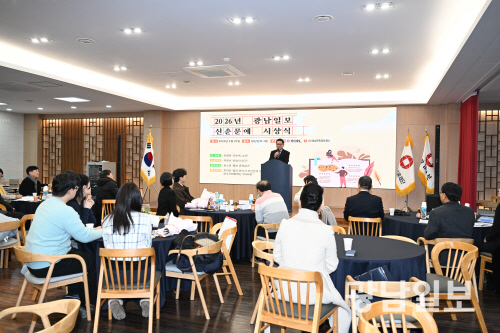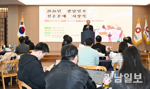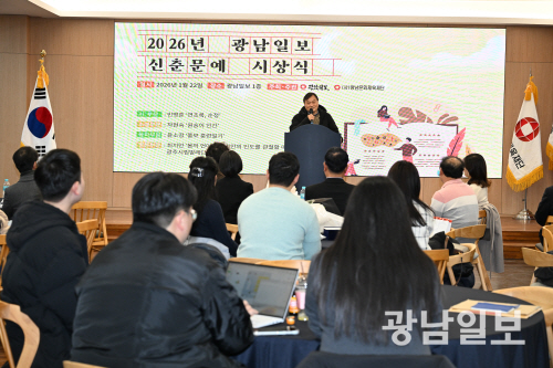이날 열린 2026 광남일보 신춘문예 시상식은 때맞춰 본보 1층 대강당이 리모델링한 뒤 처음으로 열린 행사였다. 새 건축물과 방, 공간에서 나는 냄새가 그리 나쁘지는 않은 분위기였다. 이날 시상식에는 심사위원과 당선자, 문단 내외빈, 타 언론사 기자 등이 참여했다. 대강당에 입실한 시싱식 참여자들은 자신의 명패가 부착된 자리에 하나 둘 착석했다.