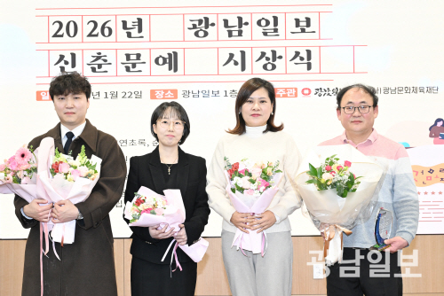 | 시상식 후 포즈를 취한 당선자들(왼쪽부터 평론 최류빈·동화 윤소정·소설 차현숙·시 민병훈 당선자) 최기남 기자 bluesky@gwangnam.co.kr |