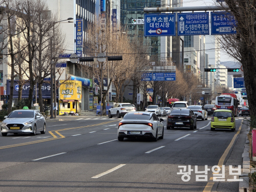 하루 평균 3만~4만대 차량이 오가는 동구 금남로5가 사거리 왕복 5차선 도로 위에는 운전자의 길 안내를 위한 도로표지판 2개가 설치돼 있다.