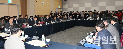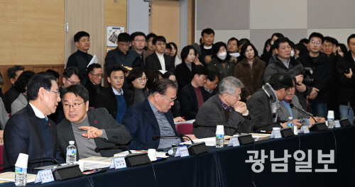 광주·전남 행정통합 특별법 검토 제3차 간담회 25일 오후 광주 서구 치평동 김대중컨벤션센터에서 열린 광주·전남 행정통합 특별법 검토 제3차 간담회에 참석한 강기정 광주시장과 김영록 전남도지사가 지역 국회의원들과 특별법 내용에 대해 논의하고 있다.최기남 기자 bluesky@gwangnam.co.k