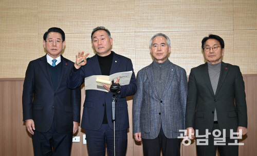 | 김원이 더불어민주당 전남도당위원장이 25일 오후 광주 서구 치평동 김대중컨벤션센터에서 열린 광주·전남 행정통합 특별법 검토 제3차 간담회에서 확정된 광주·전남특별시(가안) 및 청사위치 등에 대한 내용을 발표하고 있다.(왼쪽부터 김영록 전남도지사, 김원이 민주당 전남도당위원장.양부남 민주당 광주시당위원장,강기정 광주시장) 최기남 기자 |