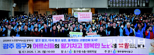 | 동구, 노인일자리 사회활동지원 발대식 26일 오전 광주 동구청 대회의실에서 열린 ‘2026년도 노인일자리 및 사회활동지원 발대식‘에 참석한 임택 동구청장과 일자리참여자, 수행기관 관계자들이 기념촬영을 하고 있다. 노인 일자리 지원사업은 공익형, 역량활용형, 공동체사업단, 취업알선형등 총4개 분야에서 4000여명의 어르신들이 동구시니어 클럽,대한노인회 광주동구지회등 8개 수행기관에서 실시된다 최기남 기자 bluesky@gwangnam.co.kr |