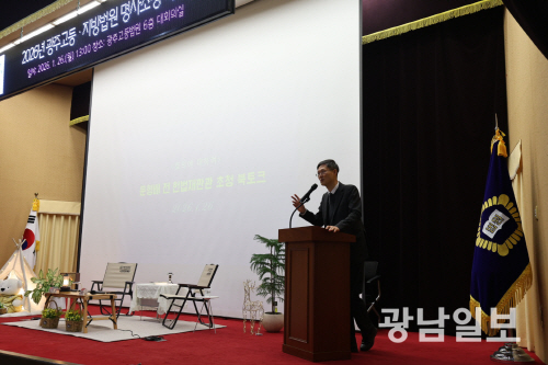 | 문형배 전 헌법재판소장 권한대행이 26일 오후 광주 동구 광주고법 대회의실에서 열린 ‘2026년 광주고법·지법 새해맞이 명사 초청 북토크’에 참석해 사법 독립과 국민 신뢰의 관계를 주제로 강연을 하고 있다. |