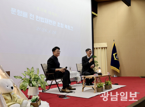 | 문형배 전 헌법재판소장 권한대행(오른쪽)이 26일 오후 광주 동구 광주고법 대회의실에서 열린 ‘2026년 광주고법·지법 새해맞이 명사 초청 북토크’에 참석해 사법 독립과 국민 신뢰의 관계를 주제로 강연을 하고 있다. |