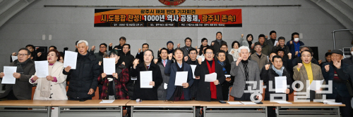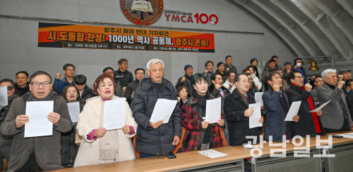 | 시도 통합 찬성·광주시 해체 반대 시민모임 기자회견 26일 오후 광주 동구 금남로 YMCA 무진관에서 열린 ‘시도 통합 찬성·광주시 해체 반대 시민모임’ 출범 기자회견에서 참석자들이 구호를 외치고 있다. 시민모임은 “광주전남통합특별법을 통과시킬 때 지방자치법도 함께 개정해 지역균형발전과 분권 강화라는 미래지향적 목표에 대비하고, 광주 문제는 광주전남특별도-광주시-5개 구의 3단계 구도에서 해법을 찾아야 한다”고 주장했다. 이날 출범한 시민모임은 최영태 전남대 명예교수, 이명자 오월어머니집 전 관장, 조상열 대동문화재단 대표 등 60여 명으로 구성됐다.최기남 기자 bluesky@gwangnam.co.kr |