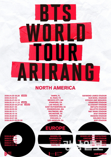 방탄소년단은 오는 4월 25·26·28일 미국 탬파 레이먼드 제임스 스타디움을 시작으로 엘파소, 멕시코시티, 스탠퍼드, 라스베이거스 등 12개 도시에서 31회에 걸쳐 북미 공연을 연다.