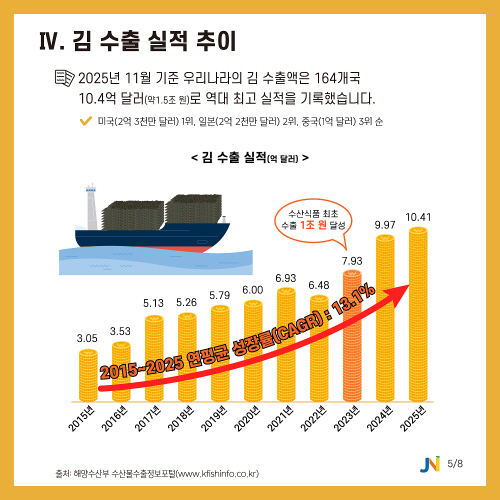 이 같은 성장세는 2025년에도 이어져, 11월 기준 김 누적 수출액은 10억4000만 달러를 넘어섰다. 수출 대상국은 164개국에 달하며, 국가별로는 미국이 2억3000만 달러로 가장 많았고 일본(2억2000만 달러), 중국(1억 달러)이 뒤를 이었다.