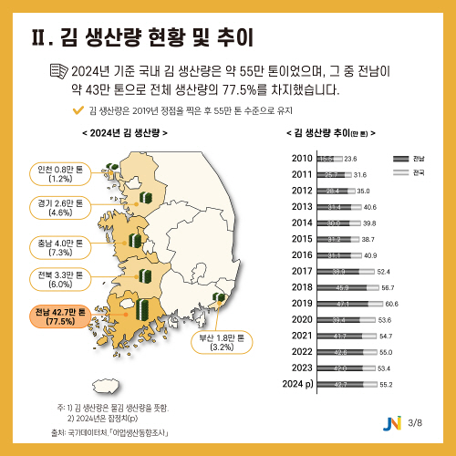 분석에 따르면 2024년 기준 국내 김 생산량은 약 55만t으로, 이 가운데 전남이 약 43만t을 생산해 전체의 77.5%를 차지했다. 김 양식이 1600년대 전남 광양 태인도에서 시작된 이후, 현재까지도 전남이 생산 기반과 양식 기술을 주도하며 산업 중심지 역할을 이어오고 있다는 점에서 상징성과 실질을 모두 갖춘 지역으로 평가된다.