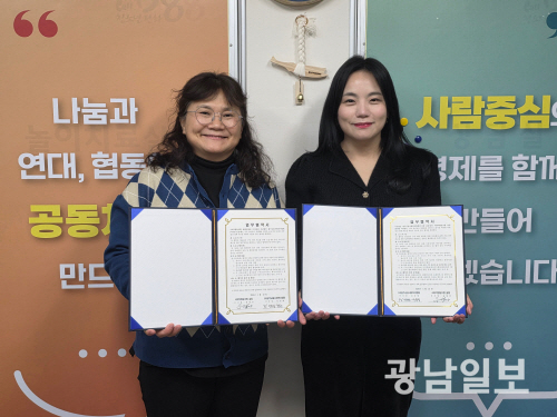 | (사)광주금융사회복지협회와 사회적협동조합 살림은 최근 지역 청년도전지원사업 추진과 청년문제 등 사회문제 해결, 청년 사회적기업가 발굴·육성 등을 위한 업무협약(MOU)을 체결했다. 왼쪽부터 윤봉란 사회적협동조합 살림 이사장, 구문정 광주금융사회복지협회 상임이사. |