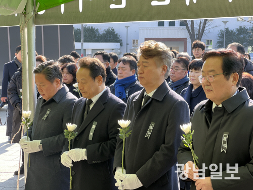 임택 동구청장, 김이강 서구청장, 김병내 남구청장, 문인 북구청장을 비롯해 더불어민주당 당직자들은 제단 앞에 국화를 올린 뒤 묵념을 이어갔다.