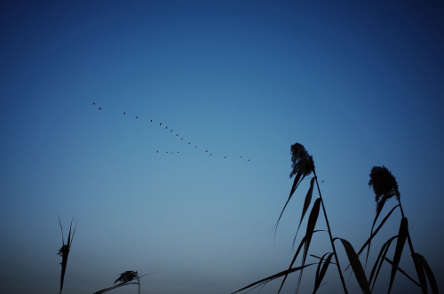| 순천만습지 갈대 위 하늘을 날고 있는 흑두루미. |
