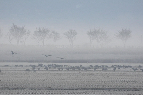 | 순천만습지 인근 안개 낀 농경지에서 먹이활동을 하고 있는 흑두루미. |
