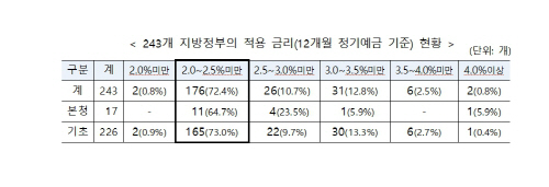 전국 243개 지방정부의 금고 이자율을 조사한 결과, 12개월 이상 정기예금 금리는 전국 평균 2.53%(공개 이자율 기준)로 집계됐다.