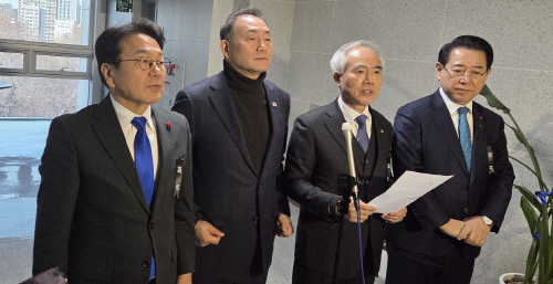 | 강기정 광주시장(왼쪽 첫번째), 김영록 전남지사(오른쪽 첫번째), 양부남 더불어민주당 광주시당위원장(오른쪽 두번째)과 김원이 전남도당위원장이 지난 27일 오전 행정통합특별법 발의를 위한 간담회를 마치고 취재진들에게 브리핑을 하고 있다. |