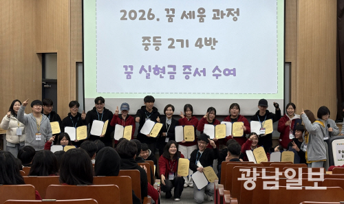 | 전남 꿈 실현 인생학교 힘찬 출발=전남교육 꿈실현재단이 ‘꿈 실현 인생학교’의 시작을 알리는 ‘꿈 세움 과정’ 1, 2기 캠프를 지난 23일부터 29일까지 목포대학교 도림캠퍼스에서 성공적으로 마무리했다. ‘꿈 실현 인생학교’는 “내 인생은 내가 설계한다”는 비전 아래, 학생들이 한 해 동안 도전해 보고 싶은 목표를 스스로 찾고 경험할 수 있도록 돕는 미래인재 육성 프로젝트다. 사진은 ‘꿈 실현 인생학교’에 참여한 학생들이 ‘꿈 세움 과정’ 캠프 수료 후 기념사진 촬영을 하고 있다. 사진제공=전남도교육청 |