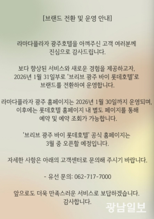 29일 시카프관광개발(주) 등에 따르면 라마다 플라자 광주호텔이 31일부터 ‘브리브 광주 바이 롯데호텔’로, 라마다 플라자 충장호텔은 ‘L7충장 바이 롯데호텔’로 브랜드를 변경한다.