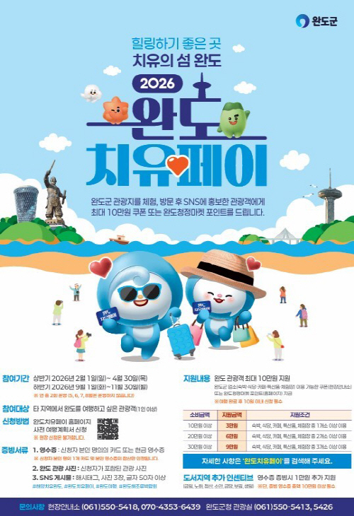 완도군 관계자는 “지난해 4만명이 넘게 참여할 정도로 완도치유페이가 인기였다”며 “완도 여행을 즐기고 혜택도 꼭 받아가시길 바란다”고 말했다.