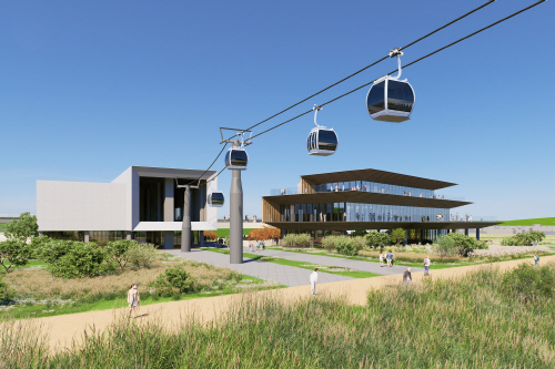 | 구례군은 구례 섬진강케이블카 설치사업의 본격적인 추진을 알리는 기공식을 오는 7일 오후 2시 오산권역 섬진강케이블카 하부정류장 부지에서 개최한다. 사진은 구례 섬진강케이블카 조감도. |