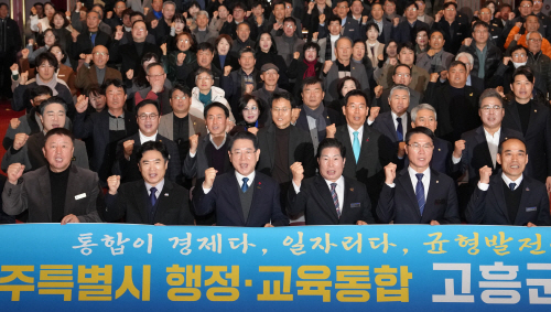 | 김영록 전남도지사가 3일 고흥문화회관 김연수실에서 열린 전남·광주 행정통합 고흥군 도민공청회에서 김대중 전남교육감 등 도민들과 기념 촬영을 하고 있다. |