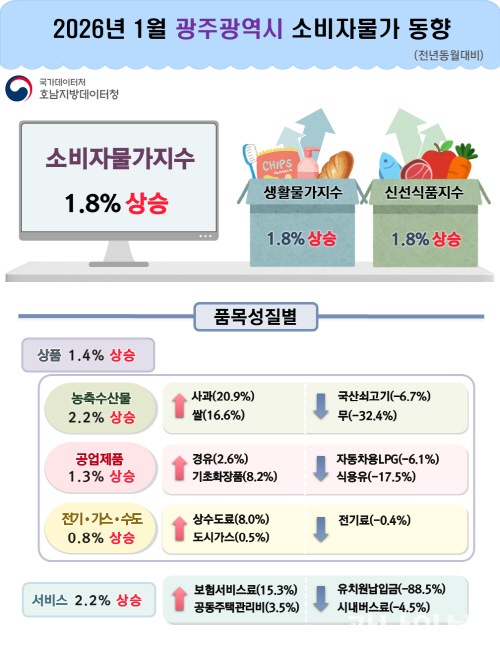 3일 국가데이터처 호남지방데이터청이 발표한 ‘2026년 1월 광주·전남 소비자물가동향’을 분석한 결과, 광주 소비자물가지수는 118.04(2020년=100)로 전년 동월 대비 1.8% 상승했다.