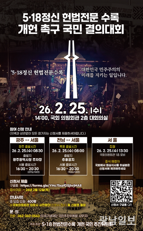 강 시장은 “5·18은 액자가 아니라 헌법에 새겨야 한다”며 “다시는 이 땅의 민주주의를 짓밟지 않겠다는 약속이 5·18 헌법전문 수록이다”고 강조했다.