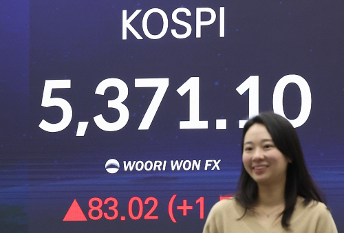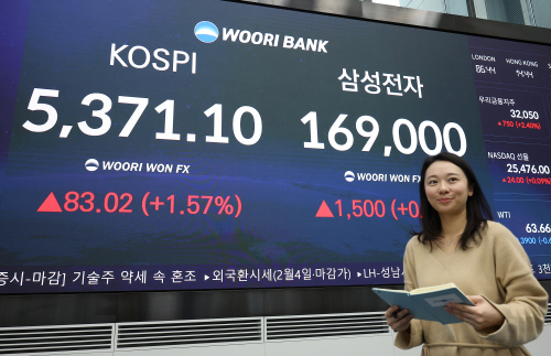 | 최고치 다시 경신한 코스피 (서울=연합뉴스) 김성민 기자 = 4일 오후 서울 중구 우리은행 딜링룸 현황판에 코스피 지수가 표시돼 있다. 이날 코스피는 전 거래일보다 83.02포인트(1.57%) 오른 5,371.10으로 마감했다. 2026.2.4 ksm7976@yna.co.kr (끝) <저작권자(c) 연합뉴스, 무단 전재-재배포, AI 학습 및 활용 금지> |