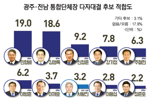 4일 광남일보와 KBC광주방송이 여론조사 전문기관 리서치뷰에 의뢰해 지난 2~3일 광주·전남 만 18세 이상 시·도민 1000명을 대상으로 실시한 여론조사 결과, ‘광주·전남 통합단체장 다자대결’에서 민형배 의원이 19.0%로 가장 높은 지지를 얻었다. 김영록 전남도지사는 18.6%로 뒤를 이었으며, 두 후보 간 격차는 0.4%p에 불과해 오차범위(±3.1%p) 내 초접전 양상을 보였다.